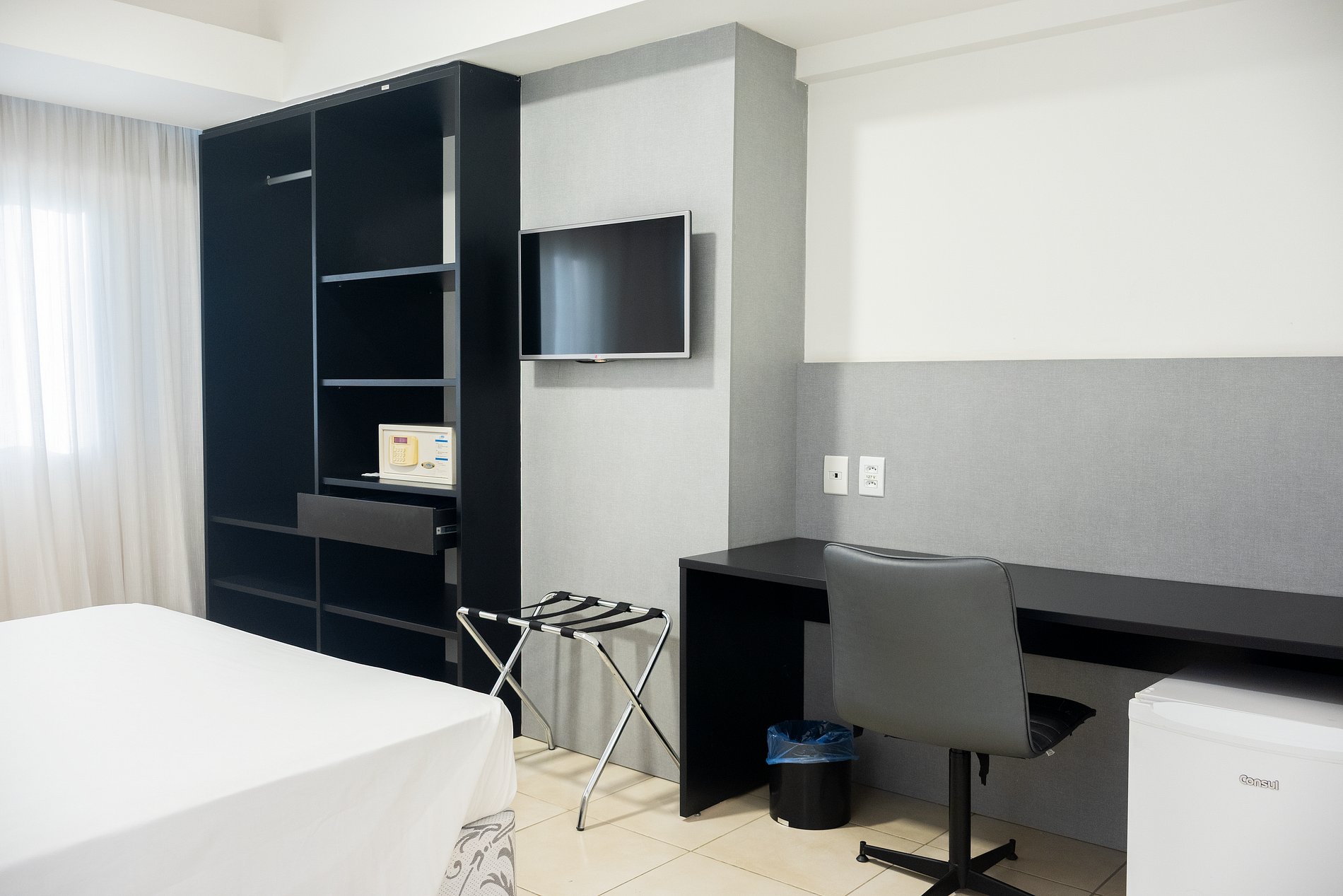 Aconchego e praticidade em um só lugar. Nosso quarto foi cuidadosamente preparado para proporcionar descanso após um dia intenso, com cama de casal confortável, ar-condicionado, Wi-fi, cofre, frigobar e TV de tela plana