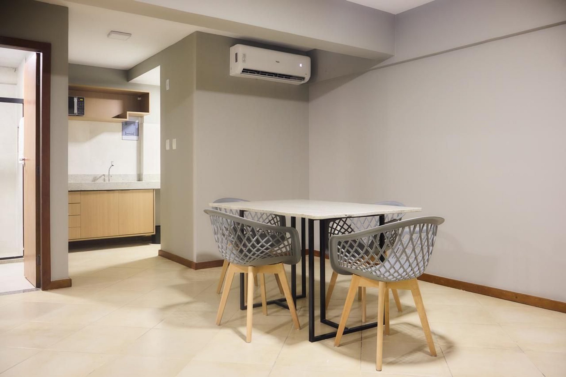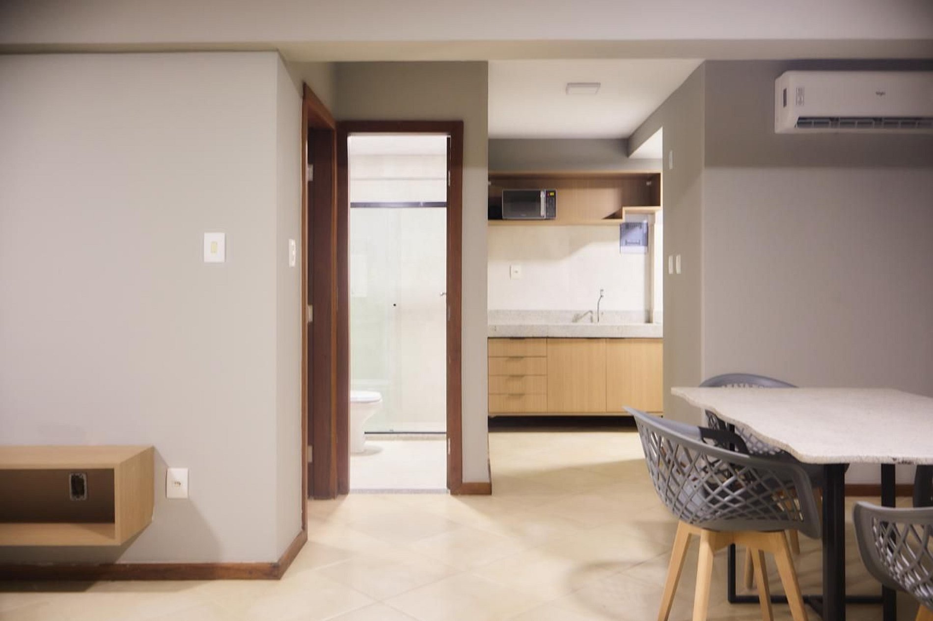 Aconchego e praticidade em um só lugar. Nosso quarto foi cuidadosamente preparado para proporcionar descanso após um dia intenso, com cama de casal confortável, ar-condicionado, TV de tela plana e Wi-fi . Sala de estar ampla, com sofá e TV de tela plana. Cozinha compacta com pia, armário, microondas, geladeira, mesa de jantar e cadeiras.